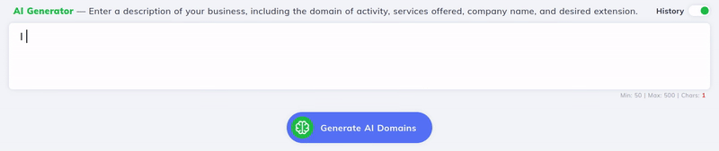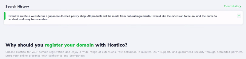 Descubre cómo la tecnología de IA de Hostico te ayuda a encontrar rápidamente el nombre de dominio ideal para tu negocio, con sugerencias personalizadas e historial de consultas.