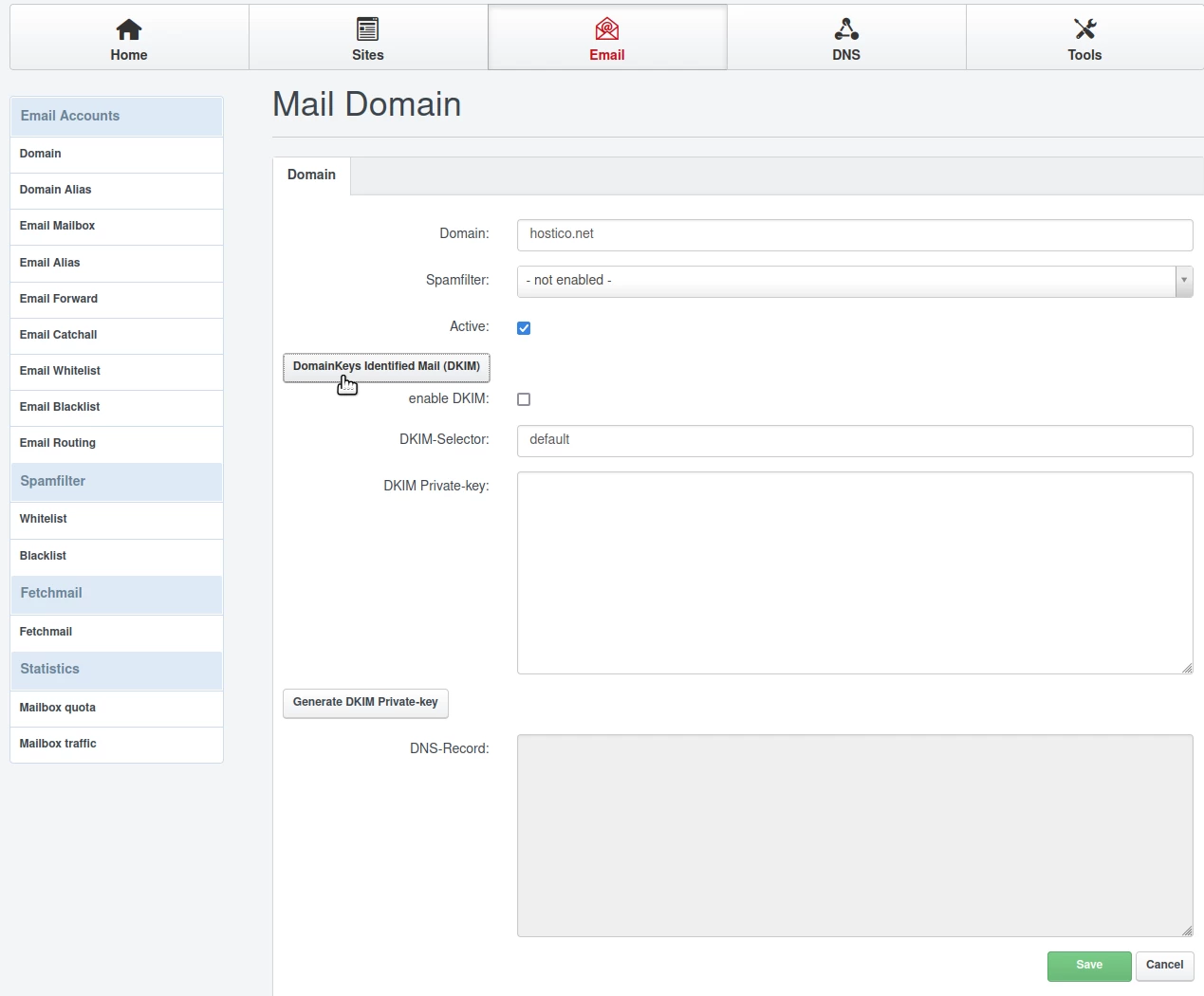 - Activo: Dejará la casilla marcada; Si también queremos configurar DKIM (protección contra spam/phishing), haremos clic en el botón DomainKeys Identified Mail (DKIM); Se recomienda pasar también por este paso;