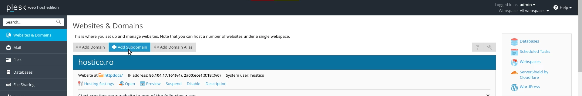 Añadiendo un subdominio en el panel de administración de Plesk.