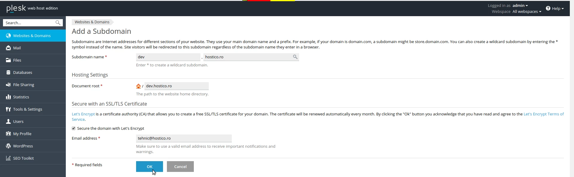 - Aquí podemos establecer la ruta para los archivos, Document root y asegurar el subdominio a través de Let's Encrypt.