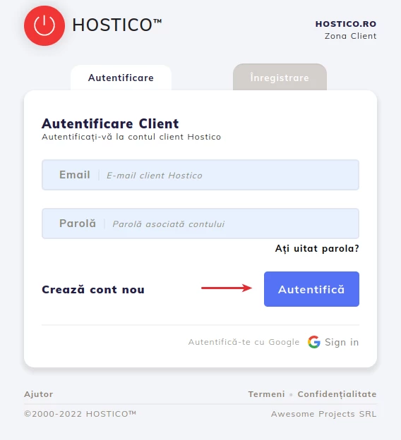 Nota: Si no recuerdas la contraseña necesaria para autenticarte en tu cuenta, accede al tutorial Restablecimiento de contraseña de la cuenta de cliente Hostico para ver los pasos necesarios para la regeneración de la contraseña.