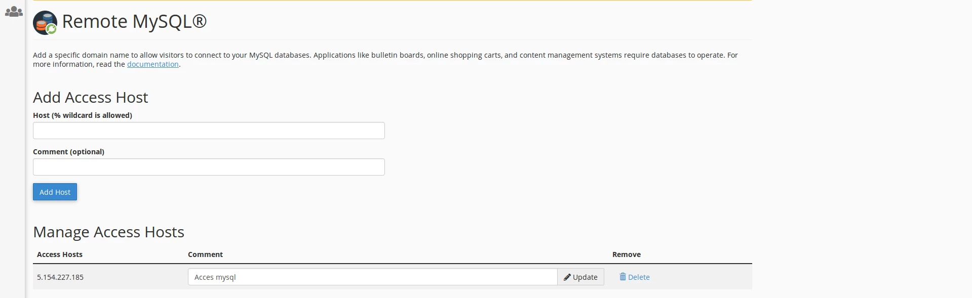 - En este tutorial, te mostraremos cómo configurar el acceso a Remote MySQL® en la cuenta de cPanel. El acceso a Remote MySQL® no está habilitado por defecto, y necesitas enviarnos un correo electrónico a help@hostico.com para su activación, acompañado de una dirección IP desde la cual se realizará la conexión.