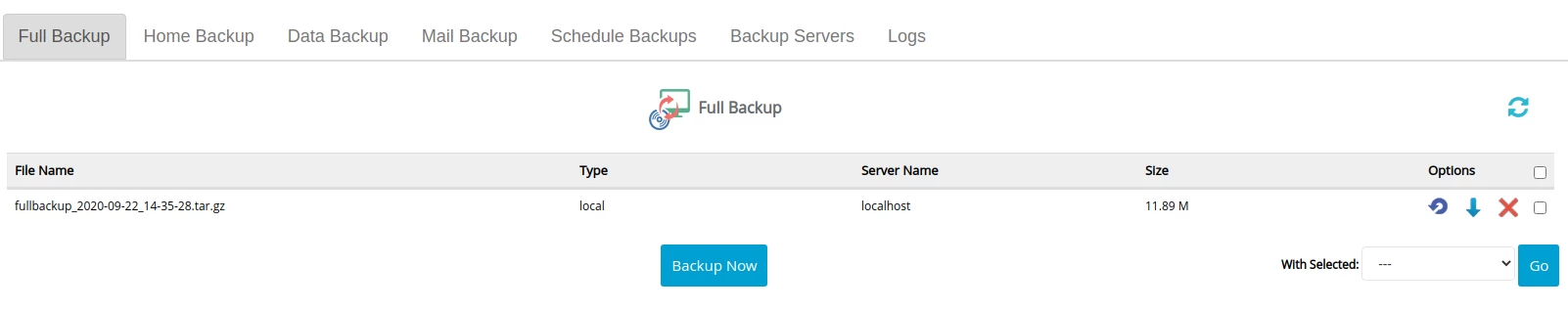 - En las pestañas a continuación, podemos seleccionar Copia de seguridad completa, Copia de seguridad en el hogar, Copia de seguridad de datos, Copia de seguridad de correo, Programar copias de seguridad, Servidores de copia de seguridad y registros.