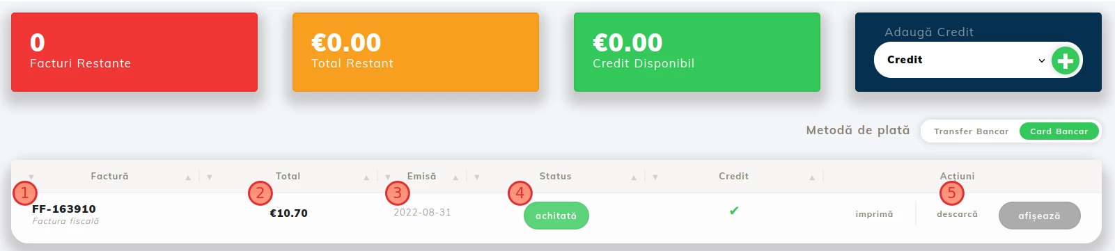 - (3) Fecha de emisión - representa la fecha en la que se emitió la proforma por el sistema (a tener en cuenta - las proformas son emitidas automáticamente por el sistema 2 semanas antes de la fecha de vencimiento) para el servicio que se va a renovar (para alojamiento) y renovado (para dominio);